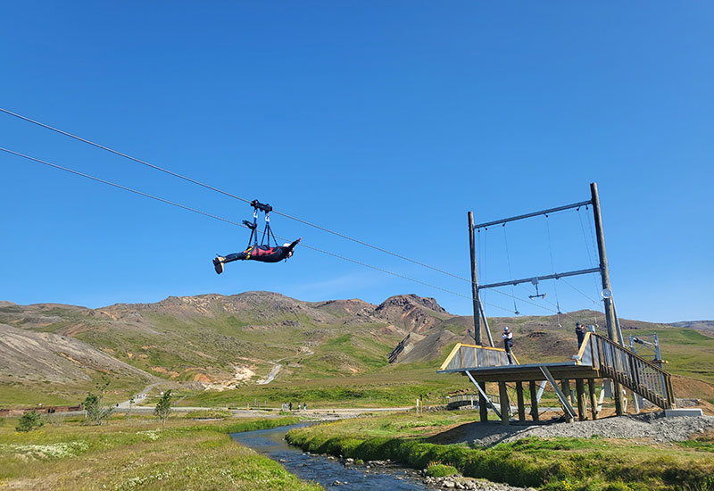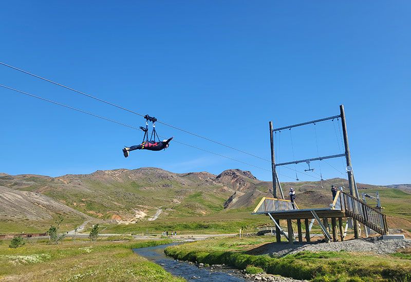 This thrilling experience stretches over a full kilometre, starting at the impressive “Black Canyon”, renowned for its beautiful waterfalls and columnar basalt formations. The tour ends at the picturesque Reykjadalsá river, near the Reykjadalur Café. This is Iceland’s longest zipline – a high-flying adventure for the whole family.